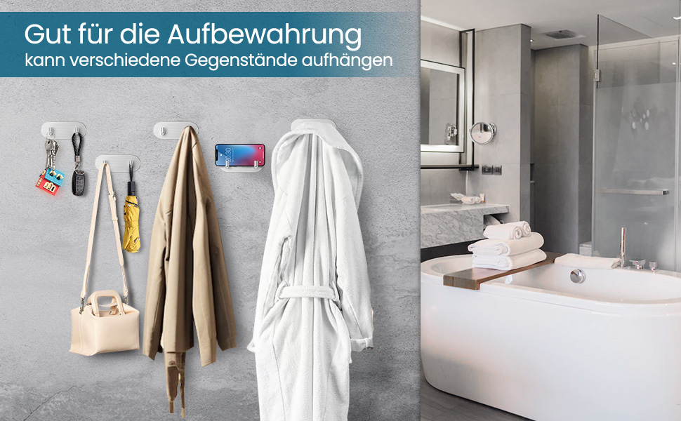 Diese selbstklebenden Kleiderhaken sind nicht nur für Handtücher geeignet, sondern auch für eine Vielzahl anderer Gegenstände wie Tücher, Schals, Mäntel, Jacken und sogar Halsketten. Die Vielseitigkeit macht sie zu einer idealen Ergänzung für jeden Raum und trägt zur optimalen Ausnutzung des zur Verfügung stehenden Platzes bei.