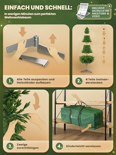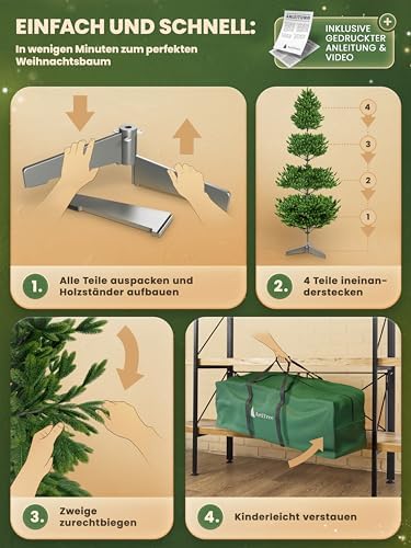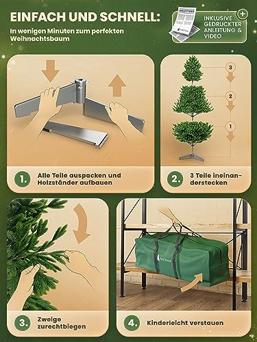 Der künstliche Weihnachtsbaum lässt sich nicht nur schnell aufstellen, sondern auch leicht verstauen. Nach den Feiertagen können Sie ihn in der mitgelieferten, reißfesten Tasche sicher verpacken. So bleibt der Baum über viele Jahre hinweg in bestem Zustand, bereit für die nächste festliche Saison.