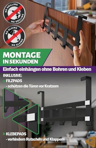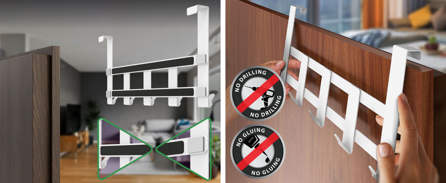 Die Montage der Garderobe könnte nicht einfacher sein. Hängen Sie die Haken einfach an die Tür, ohne zu bohren. Vorzubereitete Filzpads schützen Ihre Tür vor Kratzern, während speziell entwickelte Klebepads ein Rutschen und Klappern verhindern. So haben Sie in Sekundenschnelle eine praktische und stilvolle Aufbewahrungslösung installiert.
