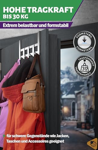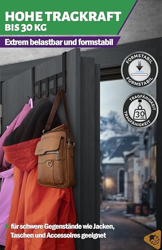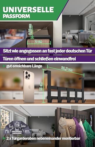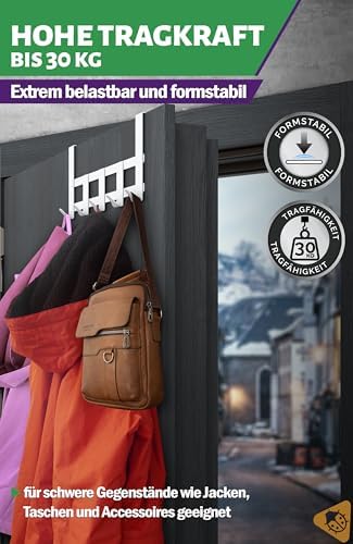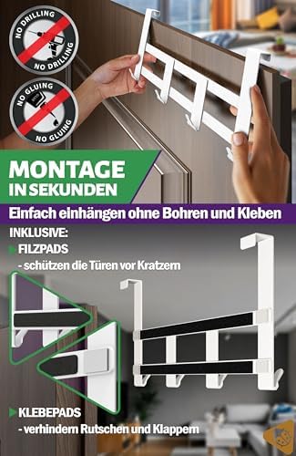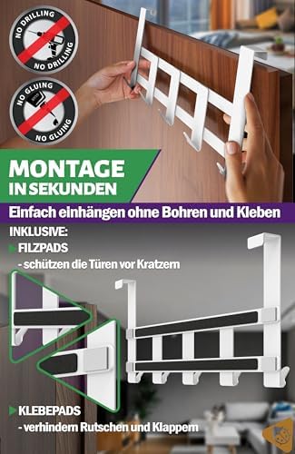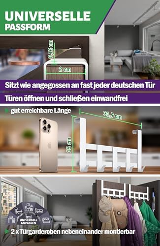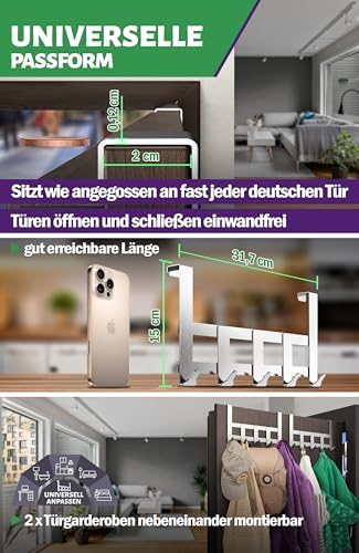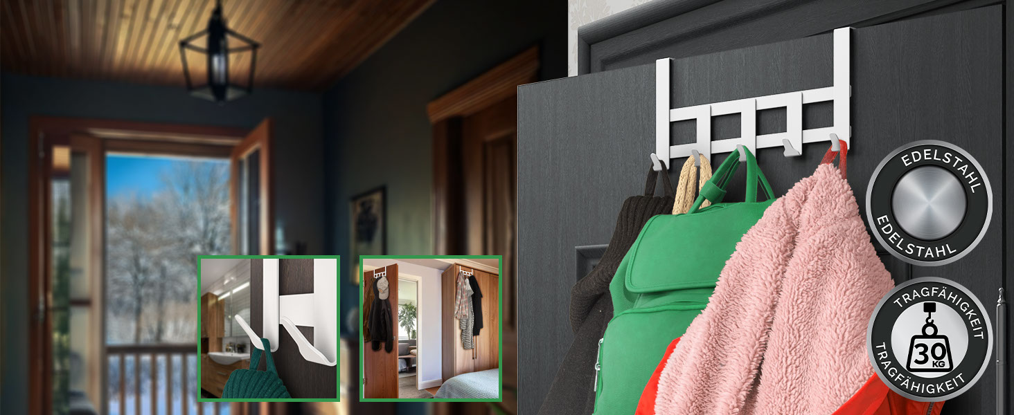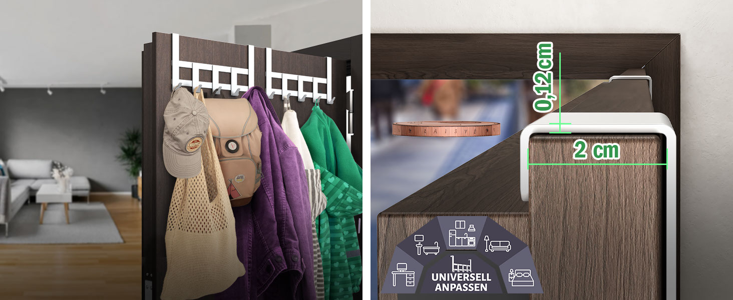 Die Türaufhänger passen an jede standardisierte deutsche Tür, ohne deren Öffnen und Schließen zu behindern. Die gut erreichbare Länge der Haken ermöglicht eine einfache Handhabung, und dank der Möglichkeit, zwei Garderoben nebeneinander zu montieren, können Sie optimalen Platz in Ihrem Eingangsbereich oder Flur nutzen.