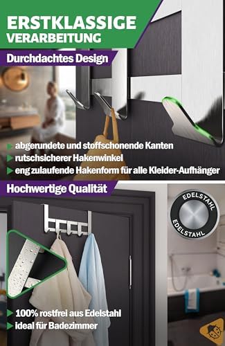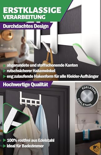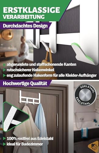 Hergestellt aus rostfreiem Edelstahl, bieten unsere Türhaken nicht nur Langlebigkeit, sondern auch eine ansprechende Ästhetik. Die nach oben abgewinkelten Türaufhänger sind mit glatten Oberflächen und abgerundeten Kanten ausgestattet, die die Kleidung schonen und ein reibungsloses Aufhängen gewährleisten. Diese durchdachte Gestaltung verhindert Beschädigungen an Ihrer Garderobe und sorgt für eine stabile Aufhängemöglichkeit.
