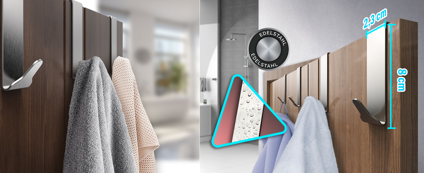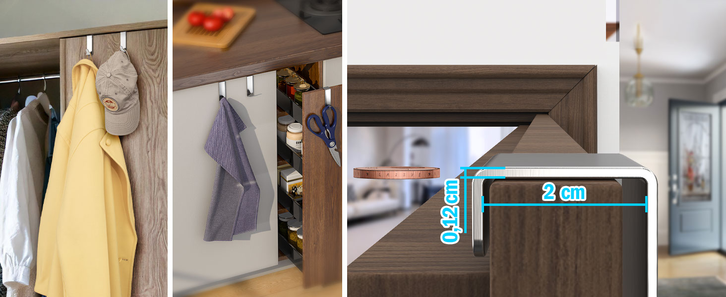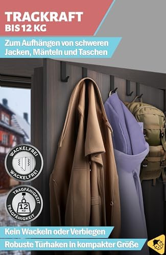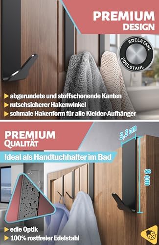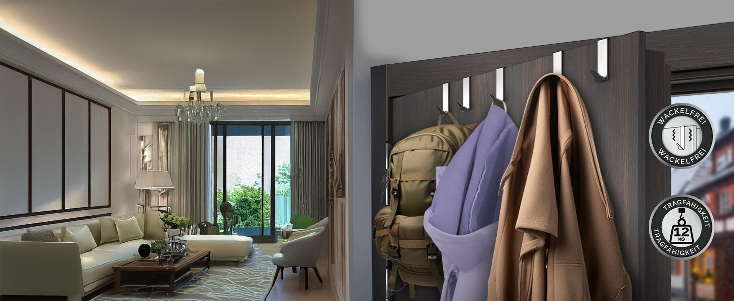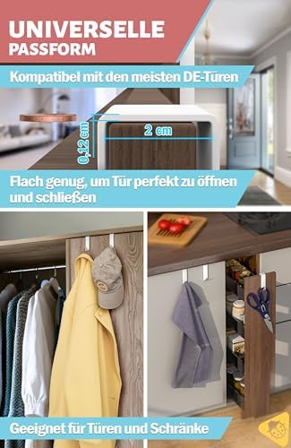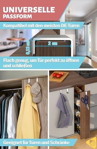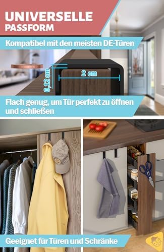 Unsere Garderobenhaken sind universell einsetzbar und passen auf die meisten Türen und Schränke. Trotz ihrer stabilen Bauweise sind sie flach genug, um die Tür problemlos zu öffnen und zu schließen.