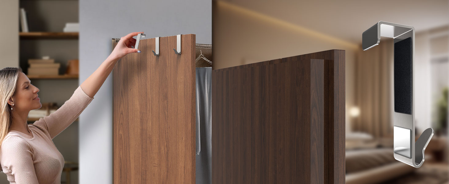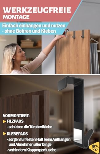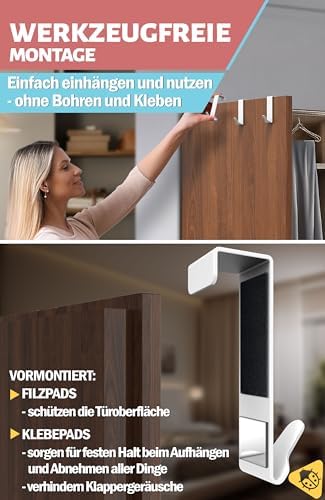 Die Montage unserer Türhaken könnte nicht einfacher sein. Sie benötigen kein Werkzeug – einfach die Haken an der Tür einhängen. Die bereits angebrachten Filzpads schützen die Türoberfläche vor Kratzern, während die Klebepads für einen festen, geräuschlosen Halt sorgen.