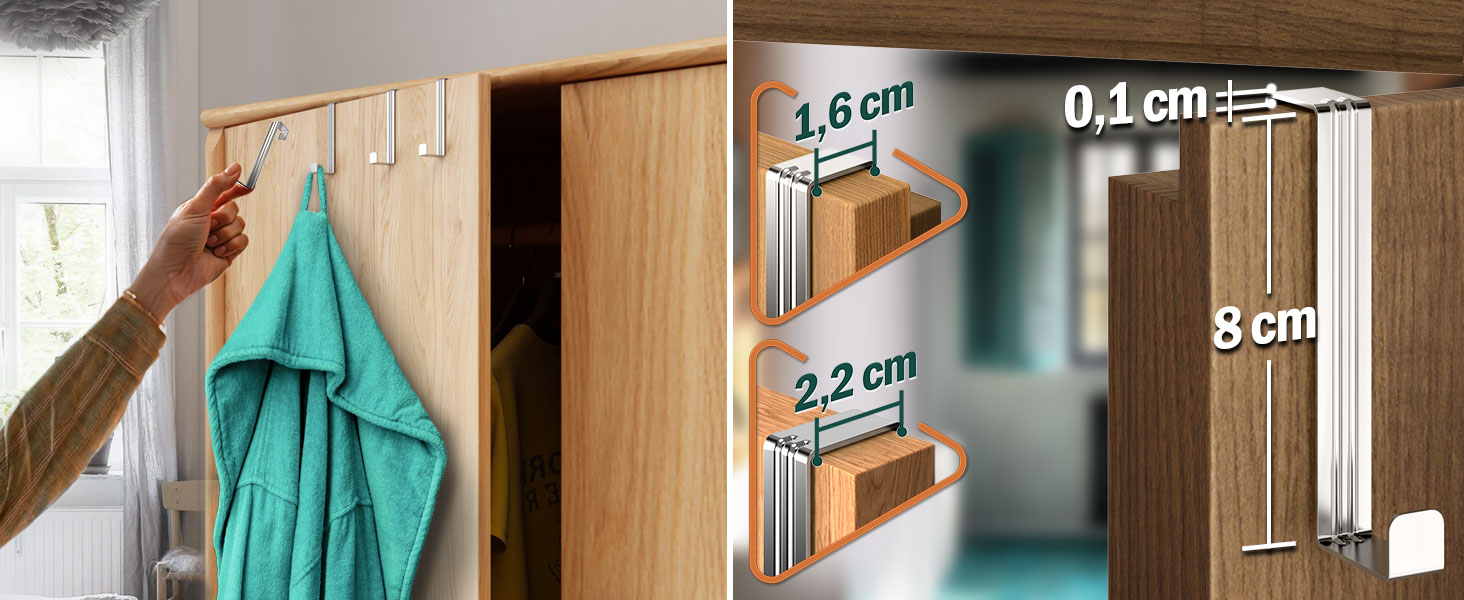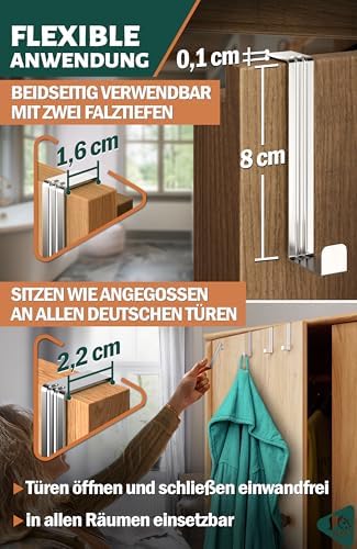 Dank der zwei Falztiefen auf beiden Seiten bieten unsere Tür Kleiderhaken eine flexible Nutzung. Dadurch können die Haken sowohl an Türblättern als auch an Schränken ohne Probleme angebracht werden, während die Türen gleichzeitig einwandfrei schließen. Außerdem können die 10 Haken individuell genutzt werden, was Ihnen die Freiheit gibt, den verfügbaren Platz optimal auszuschöpfen.