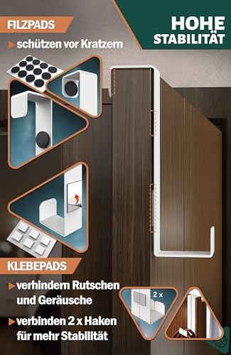 Um Kratzer an Ihren Türen zu verhindern, sind die Türhaken mit Filzpads ausgestattet. Diese Pads sorgen zusätzlich für einen sicheren und geräuschlosen Halt. Durch die Kombination mit Klebepads bieten die Türaufhänger mehr Stabilität, insbesondere wenn Sie schwere Gegenstände aufhängen möchten.