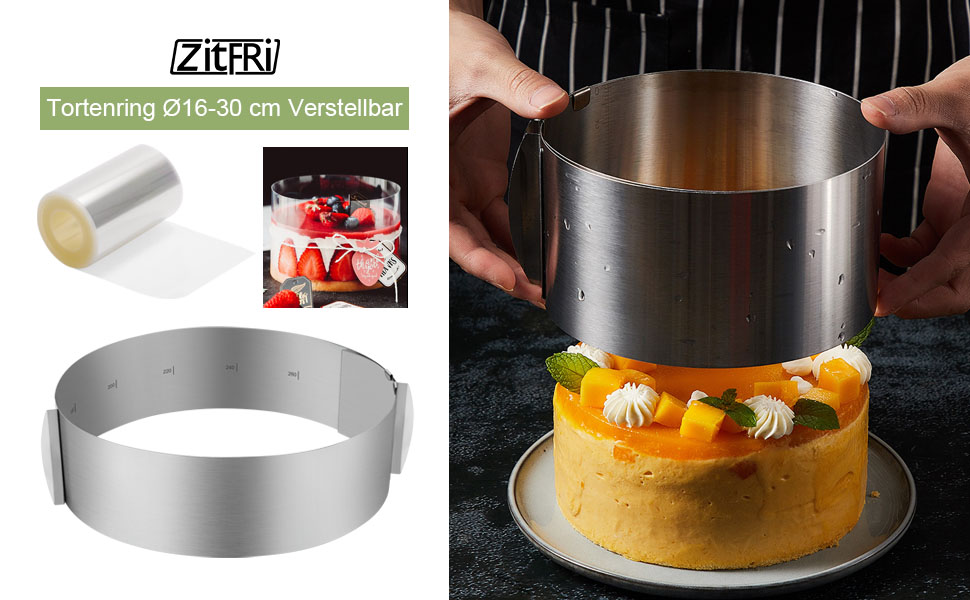 Im Lieferumfang enthalten ist der ZITFRI verstellbare Kuchenring sowie eine Rolle Tortenrandfolie (8 cm x 10 m). Diese lebensmittelechte PP-Folie ist ungiftig, geruchlos und umweltfreundlich, sodass Sie sich beim Backen keine Sorgen um die Sicherheit Ihrer Zutaten machen müssen.