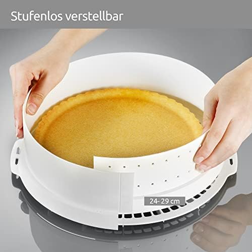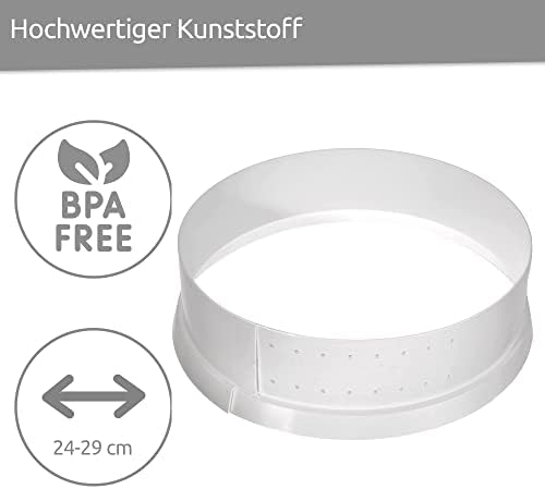 Der Tortenring ist mit einer innovativen Lochleiste ausgestattet, die eine schnelle und mühelose Anpassung des Durchmessers von 24 cm bis maximal 29 cm ermöglicht. So sind Sie in der Lage, Ihre Kreationen flexibel zu gestalten und an Ihre individuellen Backbedürfnisse anzupassen.